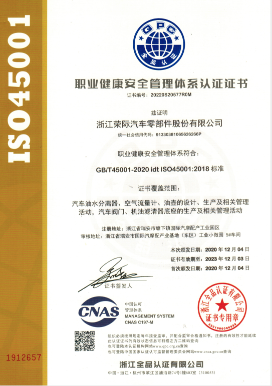 浙江荣际股份坐落于浙江省瑞安市塘下镇场桥汽配创业园。公司现有员工200多人包括工程师超20人和质检人员10人,厂房总面积17800平方米。浙江荣际成立于2006年,是一家以研发、生产和销售为一体的综合企业,主营产品为 新能源电池包护板、发动机护板、挡泥板、德系车的汽车油分离器、机滤座总成、暖风水阀和空气流量计等。经过多年的努力,已与国内外一流的主机、配套企业、建立稳固的合作关系。产品远销美国、德国、意大利、波兰、西班牙、俄罗斯等欧美众多国家。目前与公司已经通过IATF16949质量管理体系、ISO45001职业健康管理体系、ISO14001环境管理体系;并在2018年先后荣获浙江省科技型企业和国家高新技术企业、温州市首批绿色工厂、浙江省省级研发中心。 目前公司拥有5项发明专利,2项外观专利以及20余项实用型专利。公司始终贯彻“质量第一、顾客满意、持续改进、永无止境”的宗旨,与客户携手共进,互惠互利 。